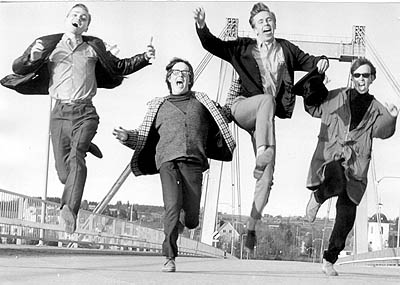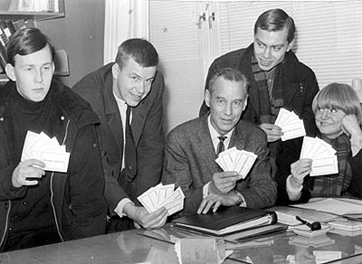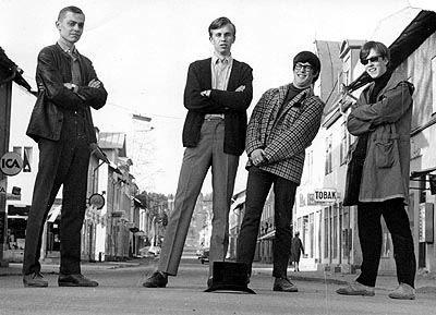 Initiativet till Sällskapet Lajbanerna togs av Jörgen Ström, som tillsammans med Sven Simonson, Hasse Ollander, Lars Olov Hjeltman och Carina Hansson utgjorde den första styrelsen, hösten 1965. Syftet - förutom att kunna ordna spelningar - var att, med kommunens hjälp, få tillgång till en bra lokal för ungdomsverksamhet. Alla politiska partier ställde upp på Sällskapets idéer - men inget blev förverkligat. Låter det bekant? På bilden ses Jörgen, Sven och Carina tillsammans med Björn Hjortling och Bror Bäckman från kommunens sida. Under våren 1966 ersattes Carina Hansson av Anders Jarefors, och dessutom tillkom Lars Thorn. På de bilder som togs i maj -66 saknas dock både Hjeltman och Thorn - på nedre bilden har dessa ersatts av en - stormhatt... I februari 1967 flyttade Jörgen Ström till Göteborg, till styrelsen knöts då Lasse Wikman, denna konstellation arbetade fram till sommaren 1967. Enligt tidningarna befarades att verksamheten sedan skulle komma att upphöra, eftersom en fungerande styrelse saknades - men när hösten kom fanns den! Larsche Hjeltman, Jan Berg och Grels Zakrisson lovade, inför spelningen med Tom&Mick, att det åtminstone skulle bli tre popkvällar... Andra personer som jobbade hårt med Lajbanerna 1965-67 (enligt Anders J):